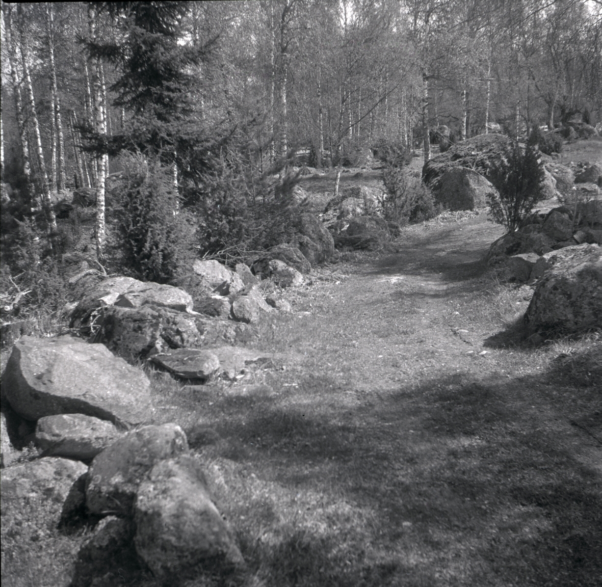 Väg kantad av stenar i Hökfors, primitiv väg skapad genom vältande av stenarna åt sidan.