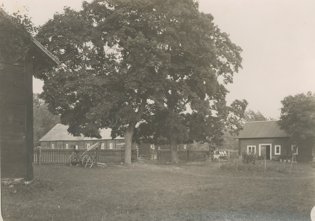 I förgrunden mangården och lönnar vid grinden mellan man- och ladugård. Till höger och vänster mangårdsflyglarna.