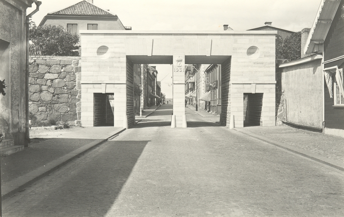 Jordbroporten vid Kaggensgatan 1931 med gamla gasverket till vänster och såkallade värmestugan till höger.