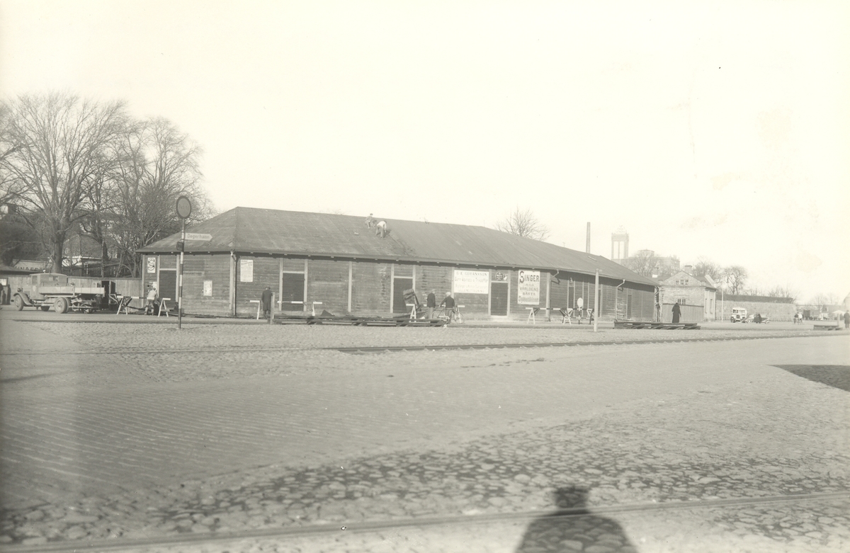 Magasinet och gamla Gasverket vid nuvarande Turistbyrån och parkeringsplatsen vid Ölandshamnen omkring 1930-35.