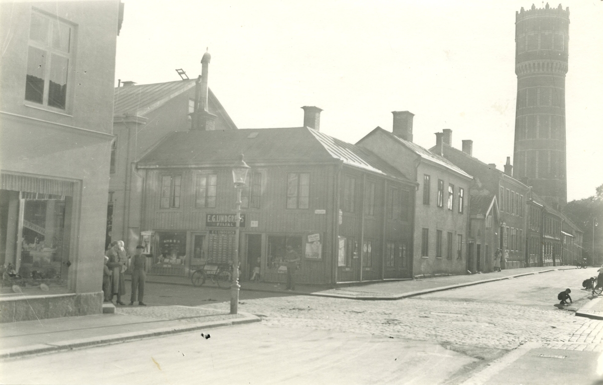 Hörnet Fiskaregatan - Kaggensgatan omkr 1929-30. Det hus som syns närmast i bild är bevarat, liksom det tredje huset i längan på andra sidan Kaggensgatan.