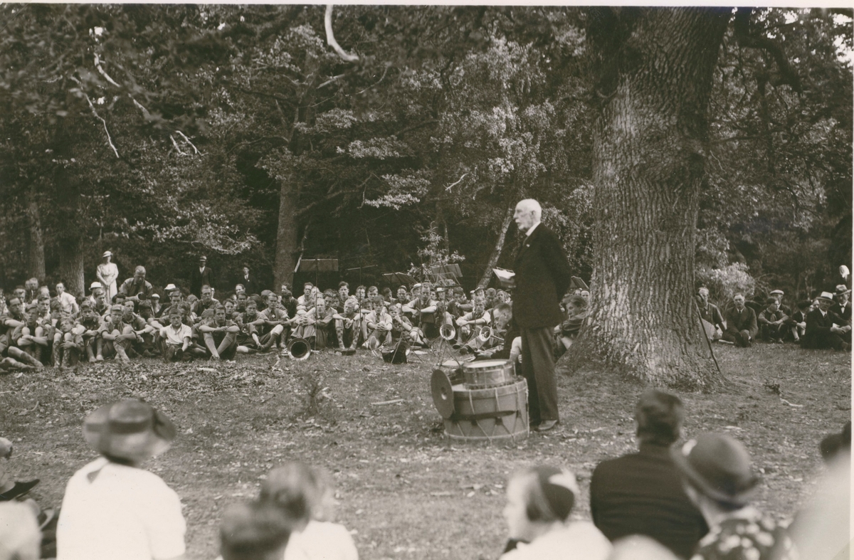 Prins Oscar Bernadotte talar till scouter vid läger på norra Saxnäs, Algutsrum sommaren 1938.