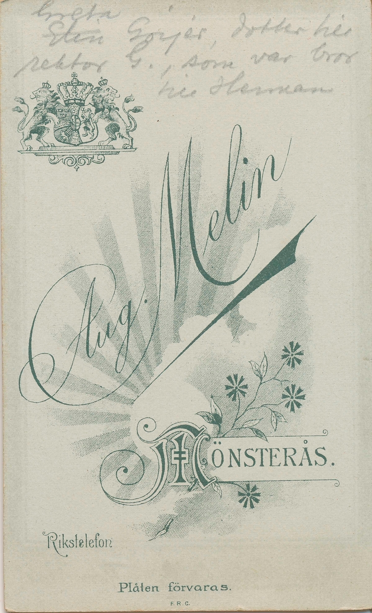 Titel: Greta Goijer, dotter till rektor Goijer, som var bror till Herman [Goijer]. Aug. Melin Mönsterås.