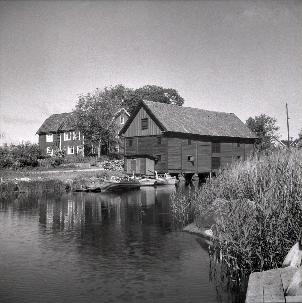 Kastmanska gården i Figeholm. Bostadshus och ekonomibyggnad samt vattendrag med eka.