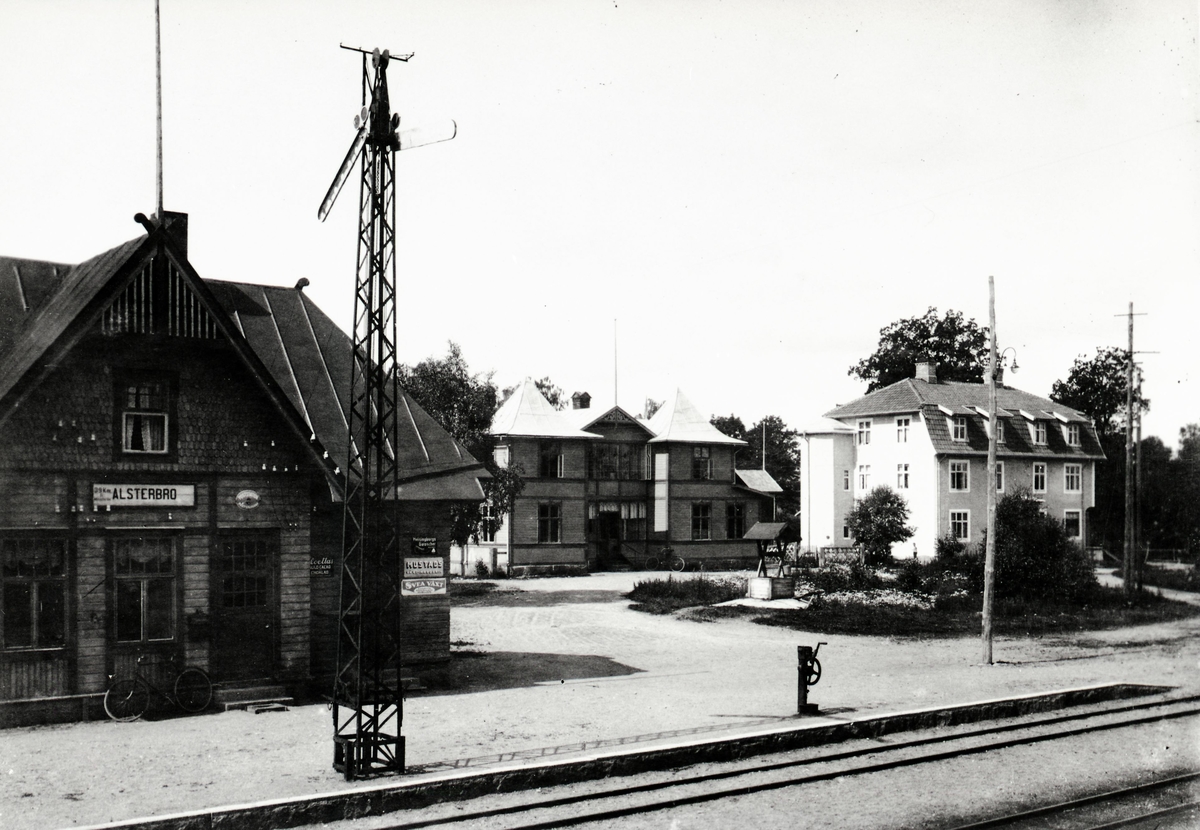 Parti av Alsterbro samhälle med järnvägsstationen till vänster och Engelbrekts hus mitt på fotot samt Anderssons hus till höger.