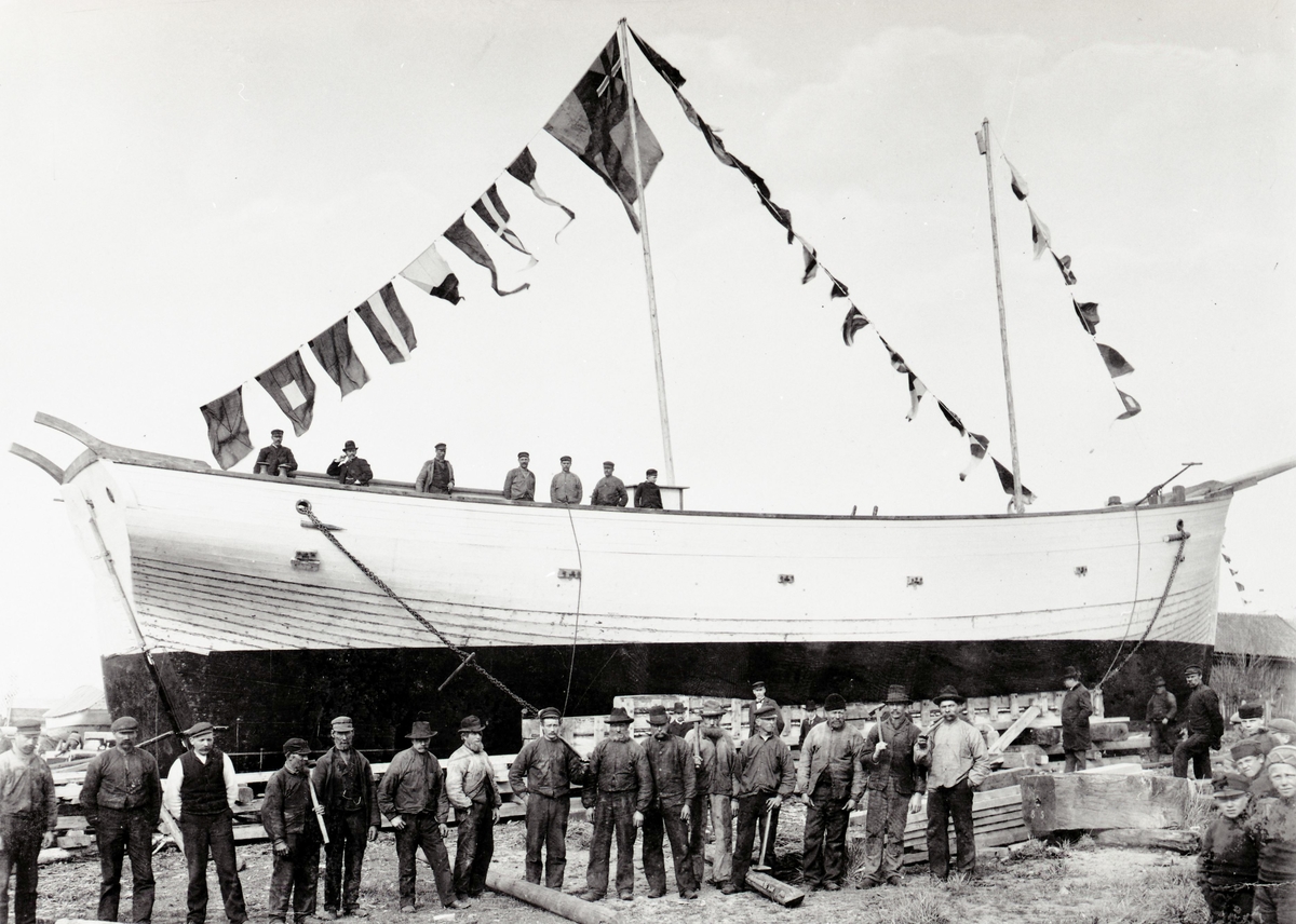 Astrid på bädden på Varvsholmen och varvsarbetare i förgrunden.