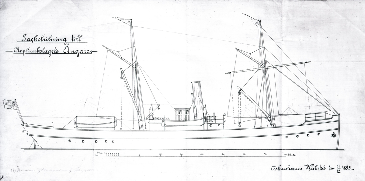 "Tackelritning till Neptunbolagets Ångare". "Oskarshamns Werkstad 11-12-1895".