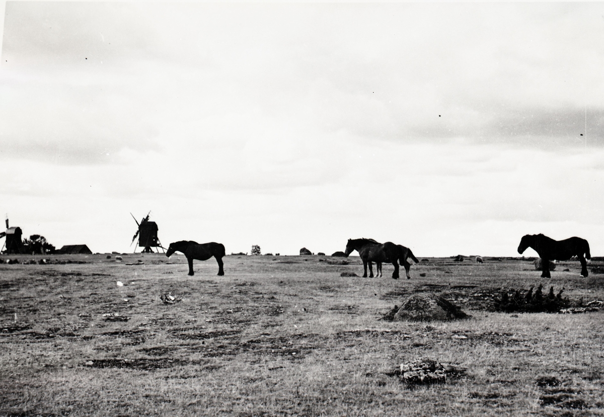 Hästar på sommarbete i Högsrums socken med väderkvarnar i bakgrunden.