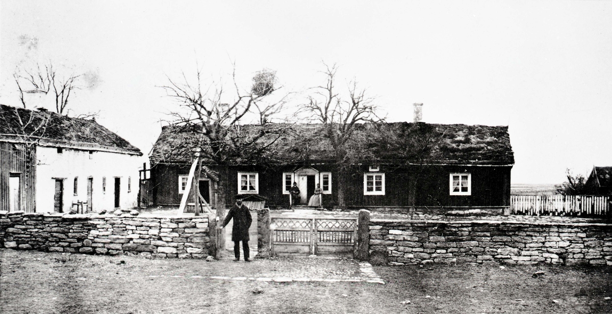 Norra Möckleby prästgård omkring 1870. På förstukvisten sitter prosten Israel Ahlqvist och hans dotter Maria Gustafva , sedermera gift med kyrkoherden Carl Gustaf Peterssohn i Halltorp och Voxtorp.