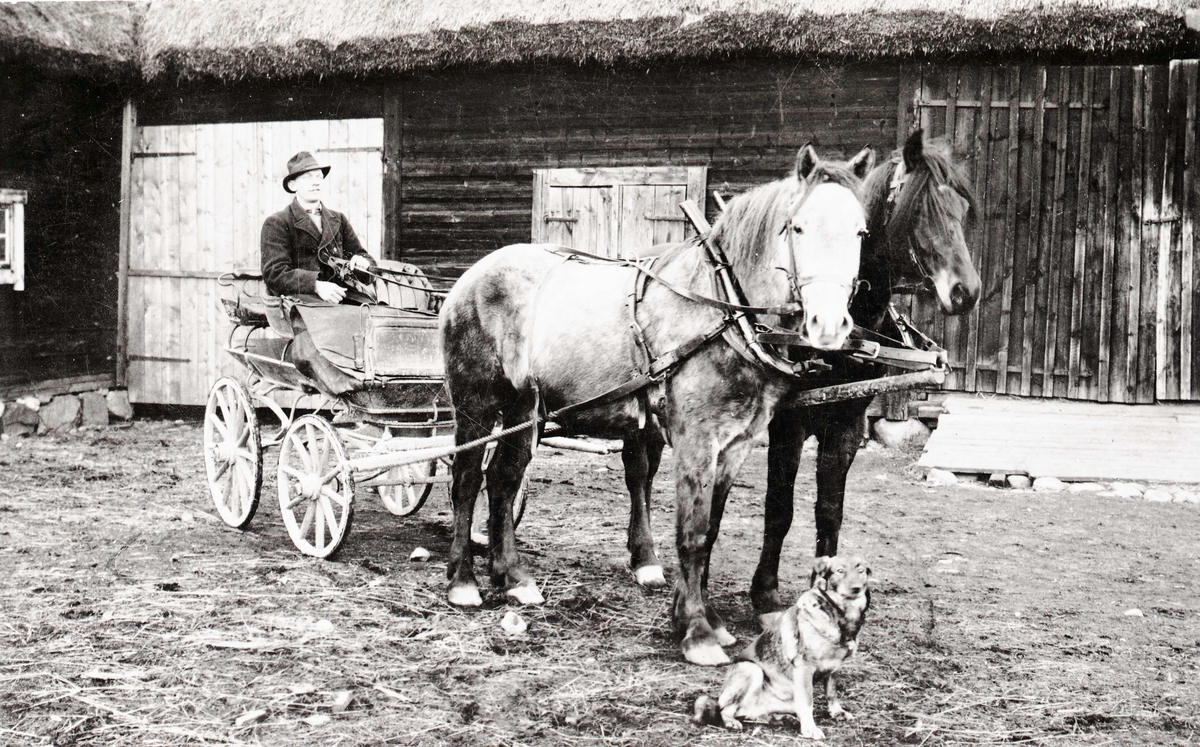 Öppen åkvagn med herre i. Dragen av parhästar. I förgrunden en hund.
