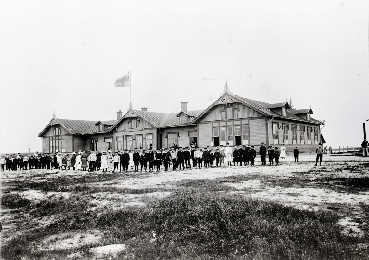 Ängöskolan. På trappan syns folkskollärare Georg Johansson iförd plommonstop.