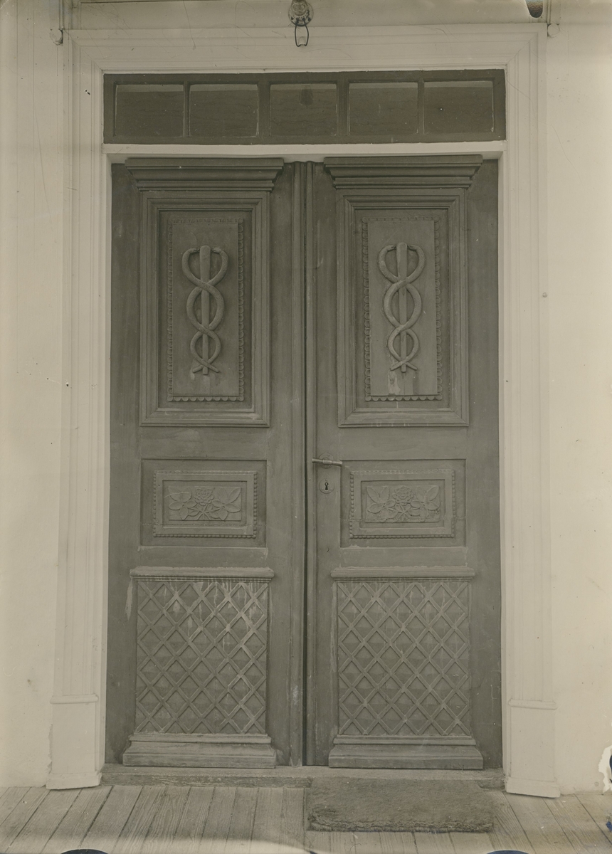 Huvudbyggnaden på Tveta gård: Dörrarna, rikt snidade med bland annat eskulapstav (en läkare, Wetterberg, lät bygga huset.)