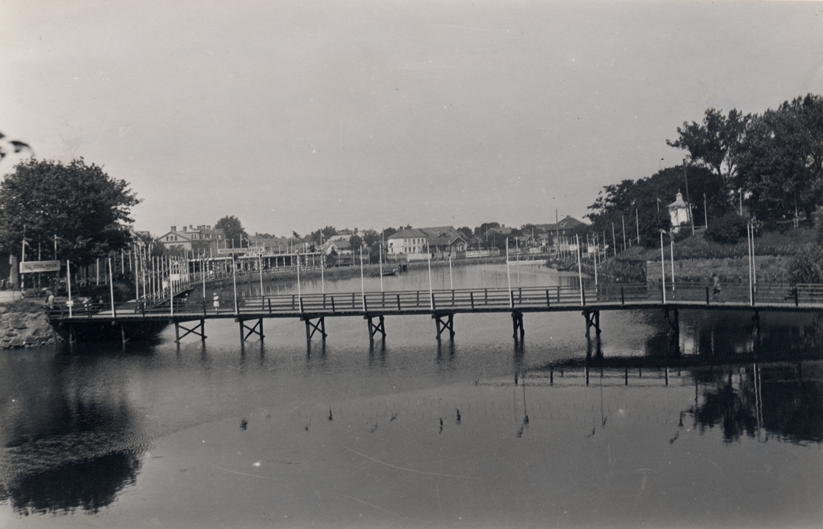 Gångbron över Systraströmmen från Rotundan till Västerport. Uppbyggd i anledning av Hantverksutställningen 1927.