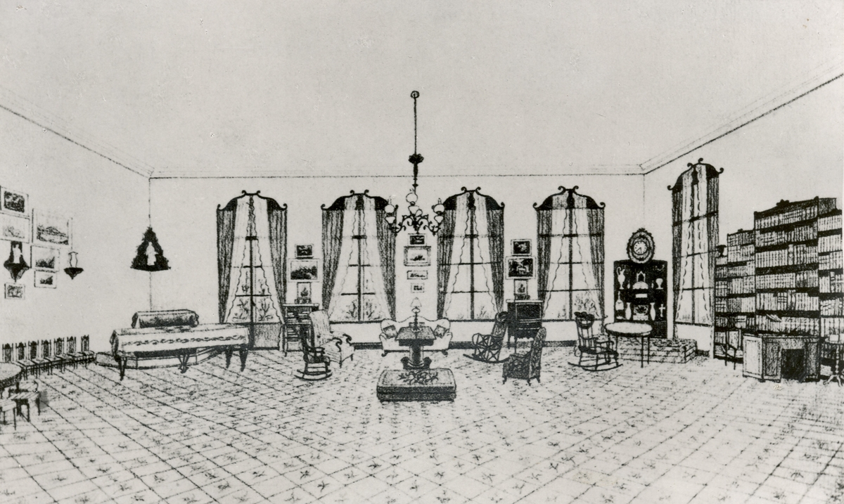 Rostadssalongen på Cecilia Fyxell tid. Under kristusbilden innerst i hörnet en orgel.