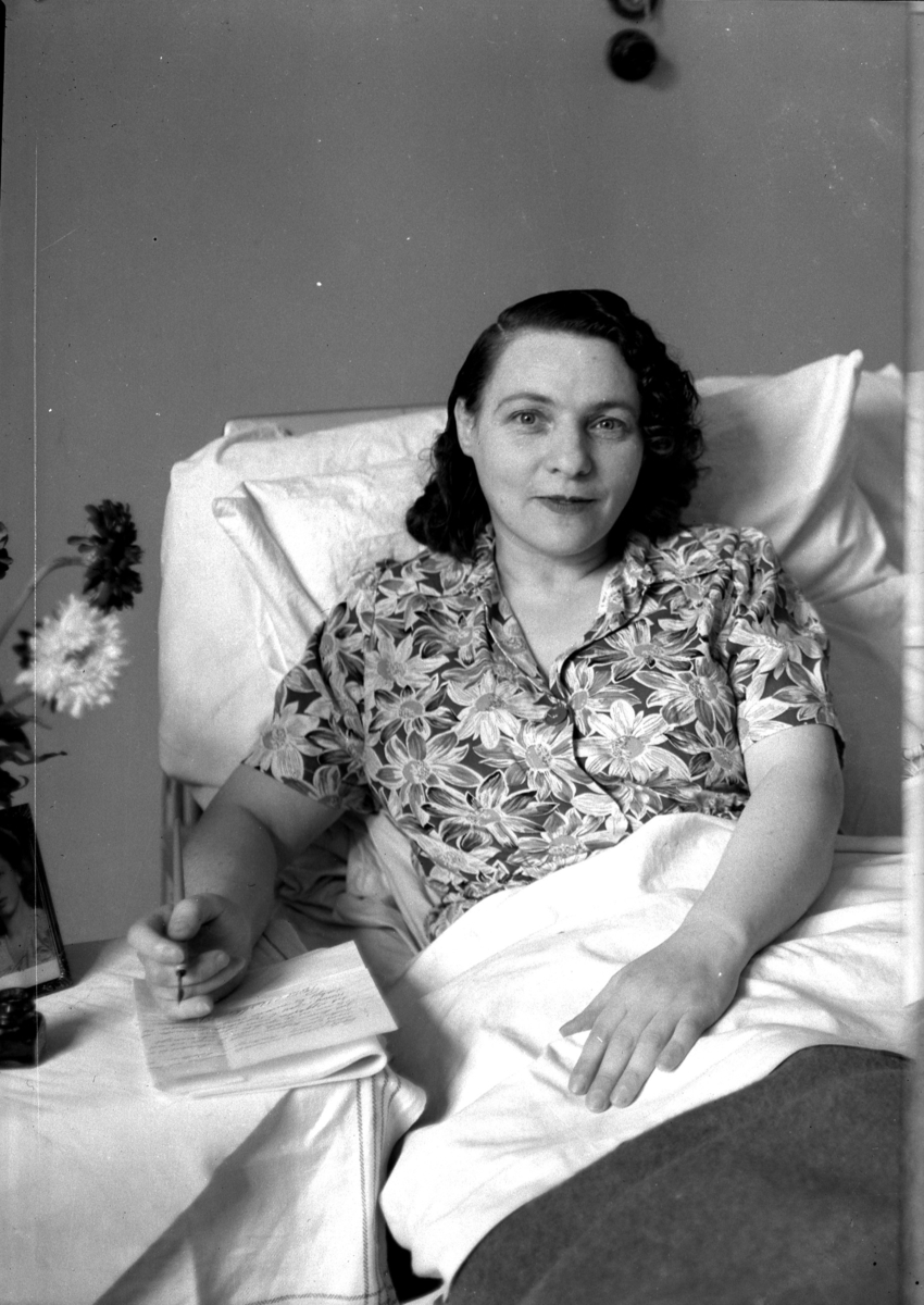 Kvinna som räddats från Bergen-Belsen i sjuksäng på Beredskapssjukhuset i Kalmar.