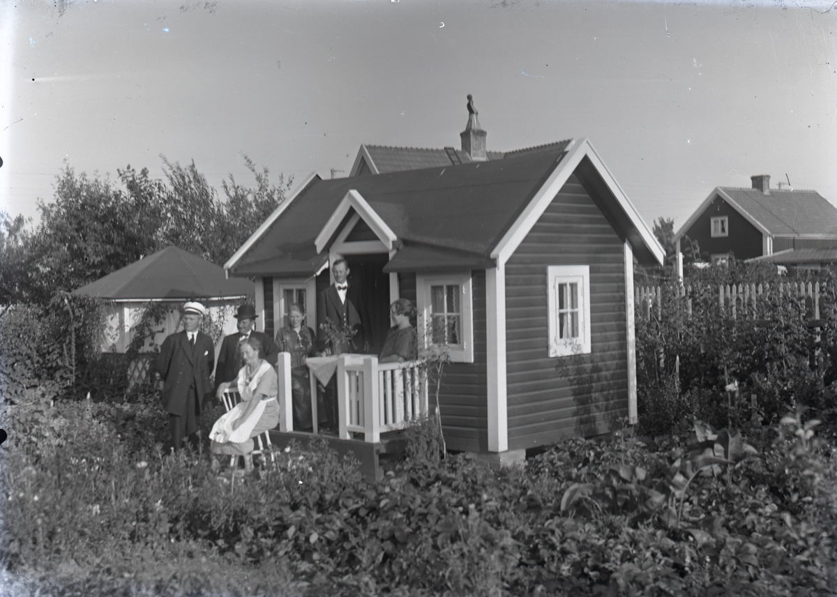 En stuga, tre män och tre kvinnor i Kalmar södra koloniområde, fotograferat omkring 1930. Kalmar södra koloniförening grundades 1917 och har idag 105 kolonilotter. Området ligger strax söder om länssjukhuset i Kalmar med huvudingång från Stensbergsvägen.
