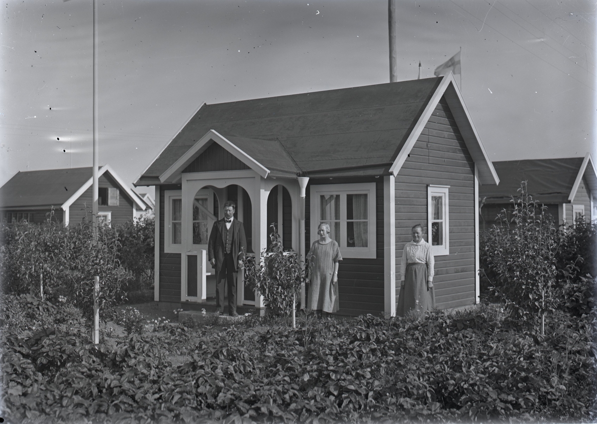 Några stugor, en man och två kvinnor i Kalmar södra koloniområde, fotograferat omkring 1930. Kalmar södra koloniförening grundades 1917 och har idag 105 kolonilotter. Området ligger strax söder om länssjukhuset i Kalmar med huvudingång från Stensbergsvägen.