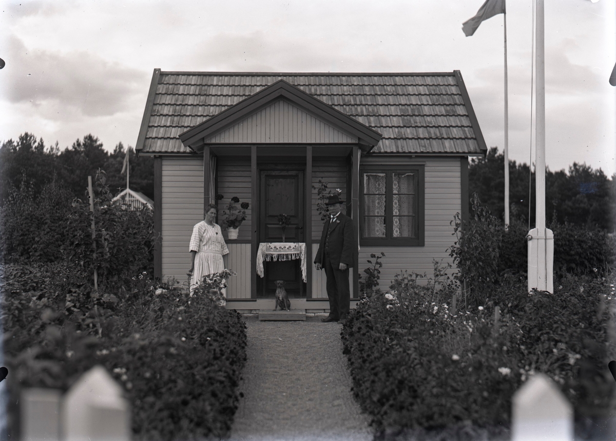 En stuga, man, kvinna och hund i Kalmar södra koloniområde, fotograferat omkring 1930. Kalmar södra koloniförening grundades 1917 och har idag 105 kolonilotter. Området ligger strax söder om länssjukhuset i Kalmar med huvudingång från Stensbergsvägen.
