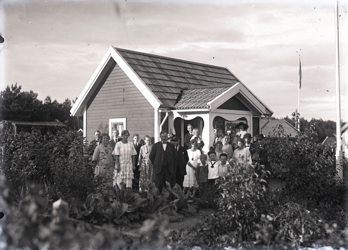 En stuga och en grupp människor i Kalmar södra koloniområde, fotograferat omkring 1930. Kalmar södra koloniförening grundades 1917 och har idag 105 kolonilotter. Området ligger strax söder om länssjukhuset i Kalmar med huvudingång från Stensbergsvägen.