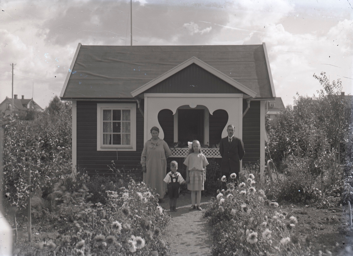 En stuga, man kvinna och två barn i Kalmar södra koloniområde, fotograferat omkring 1930. Kalmar södra koloniförening grundades 1917 och har idag 105 kolonilotter. Området ligger strax söder om länssjukhuset i Kalmar med huvudingång från Stensbergsvägen.