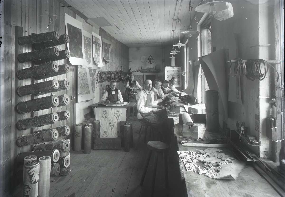 Interiör från Kalmar Nya Tapetfabrik. Iordningställande av valsarna för tryckning av tapeter.