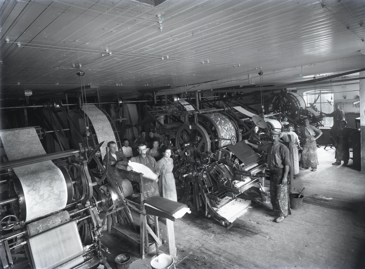 Interiör från trycksalen på Kalmar nya tapetfabrik.
