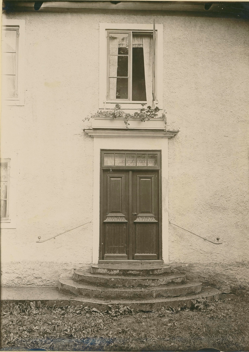 Färjestadens gård. Den högra av huvudfasadernas båda trappor. Trapporna av kalksten, halvrunda, förbundna med varandra med en stenplan i nivå med understa steget. Enkla gustavianska dörrar.