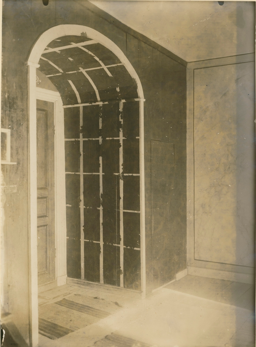 Förstugan. Väggar oljemålade, marmorering i grått och blått. I nischen spaljémönster med lönnkvistar och blad, målade grönt mot grön bakgrund. Målningen sannolikt utförd omkring 1860 av N.J. Jonsson från Glömminge.
