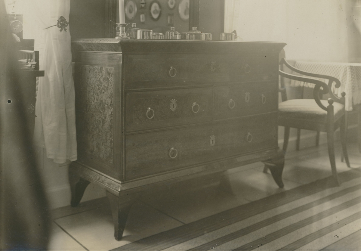 Byrå, senbarock, alrot i fyllningarna, slätt trä i ramstyckena. Mässingsbeslag i låg relief, nyckelskyltar i form av krönta kartuscher, handtagen vridna ringar upphängda i stjärnor. Fötterna nyare. Har tillhört Blekhems herrgård från början.