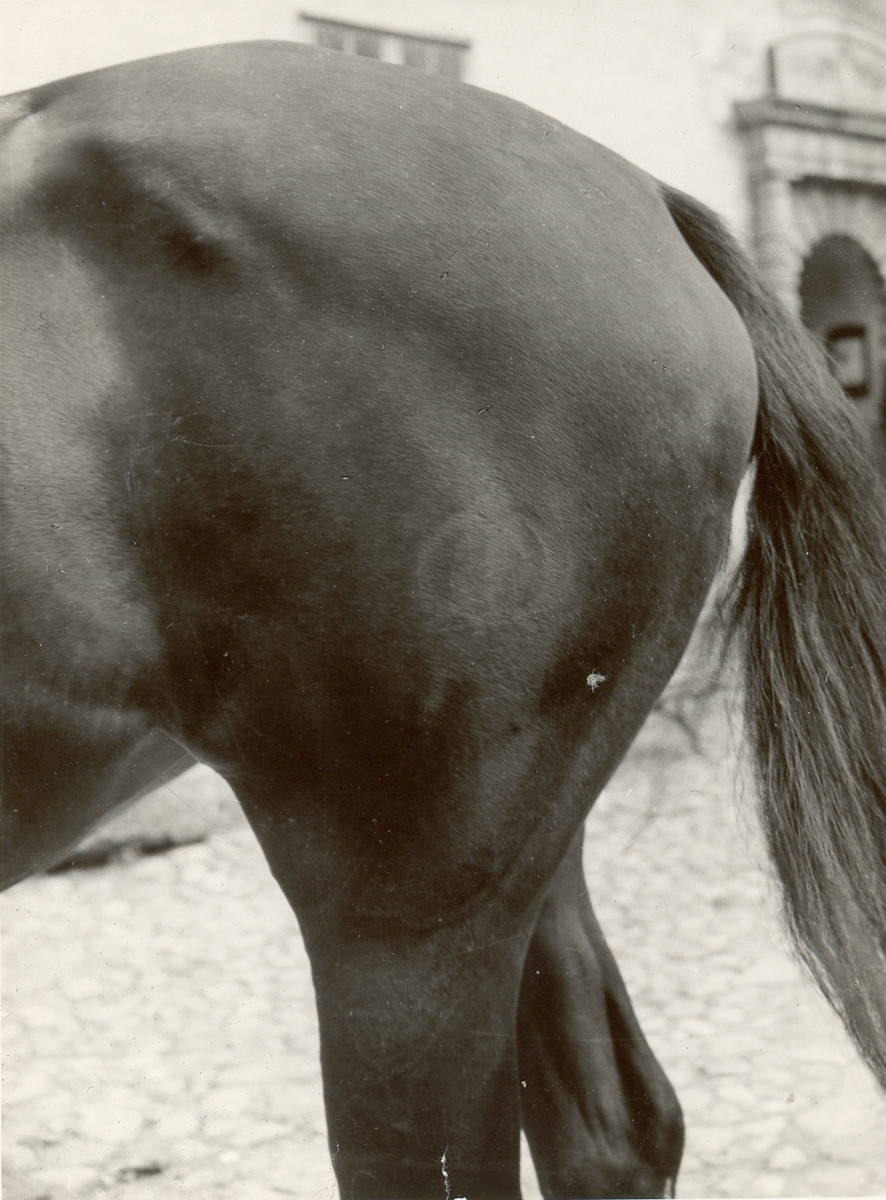 Stamhästen Anita före avlivandet. Bilden visar skvadronsmärket på länden.