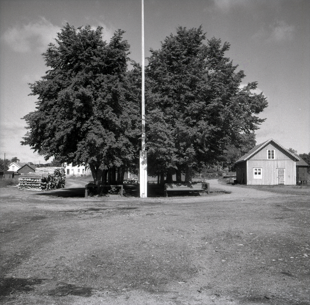 Hamnplanen i Figeholm, ekonomibyggnad, parksoffa och vedtrave.