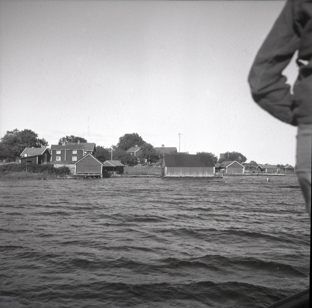 Figeholms skärgård, vy över hamnen i Örö med bostadshus sjöbod och ekonomibyggnad.