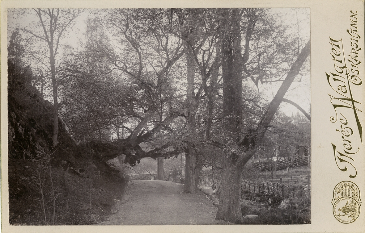 Landskap vid Norrby brunn. Hörn prägat med 1899. Ett träd hänger över vägen.