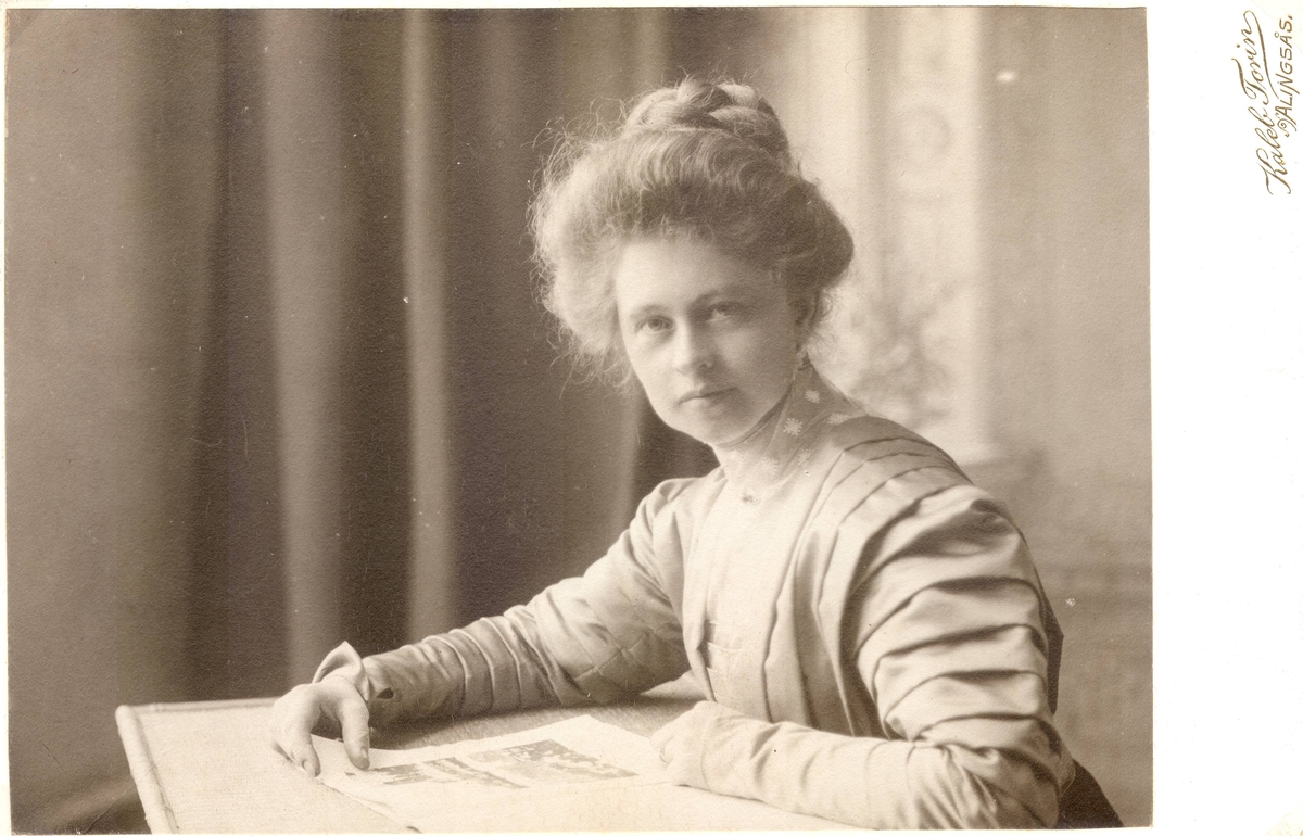 Ellen Warholm med pösigt, uppgummat hår och klänning med många veck, sittande vid ett bord. "Mösseberg 1908".