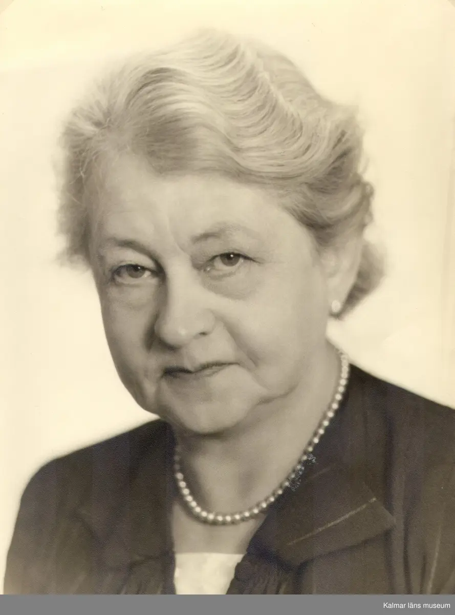 Bröstbild av Ellen Warholm som äldre med pärlhalsband och grått hår.