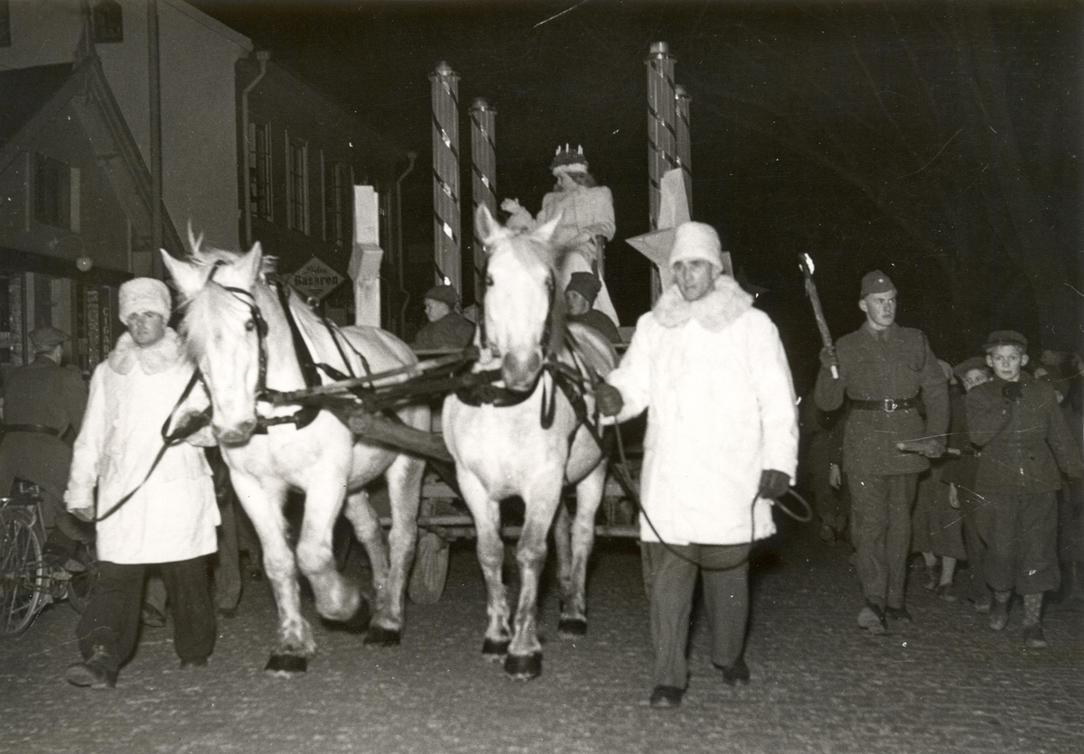 Luciafirandet i Kalmar 1941. Kalmar Ångvarns hästar och vagn. Kuskar t v Jönson och t h Sjökvist