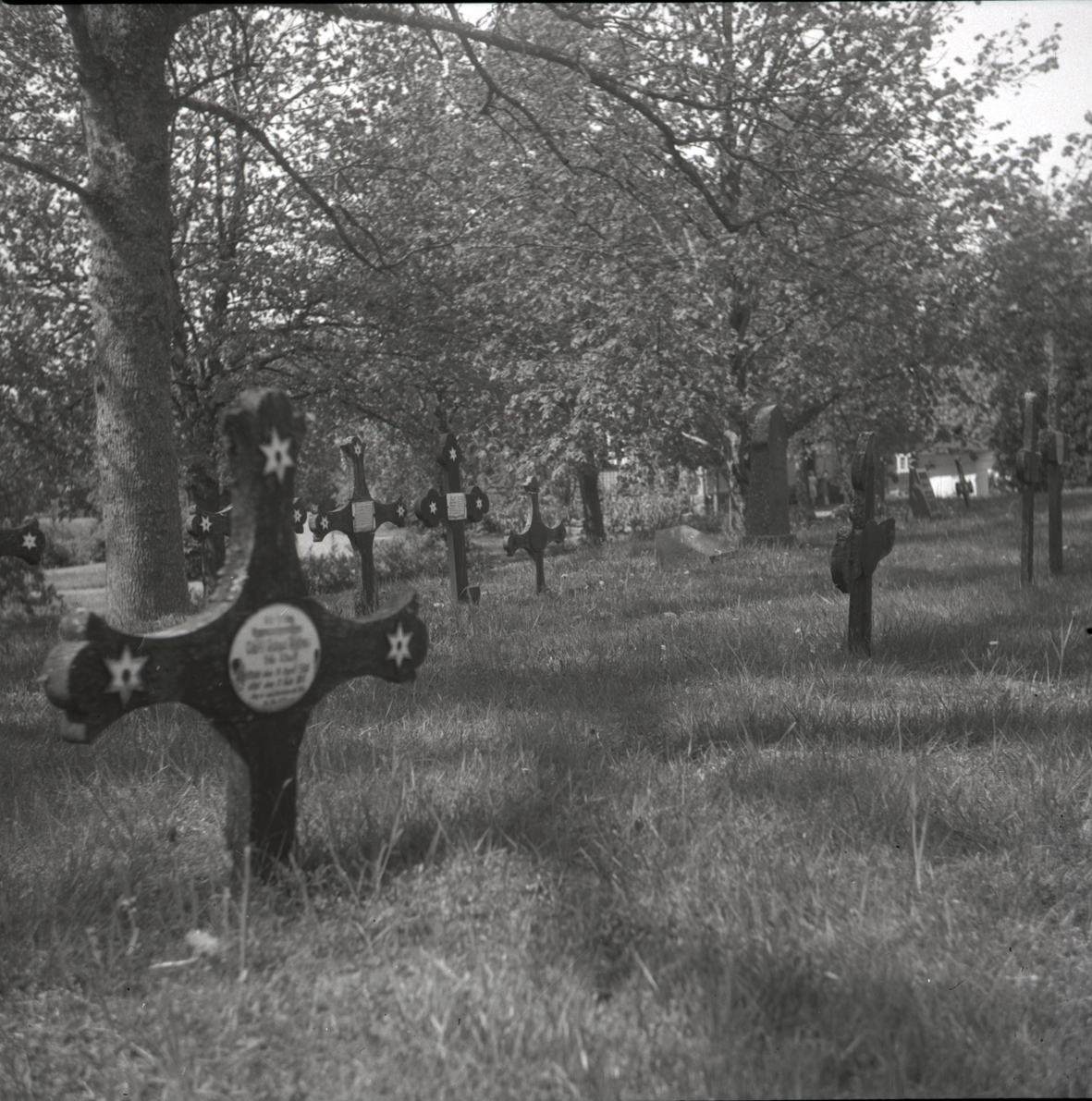 Kyrkogård vid Blackstads kyrka, gravvårdar med emaljskyltar.