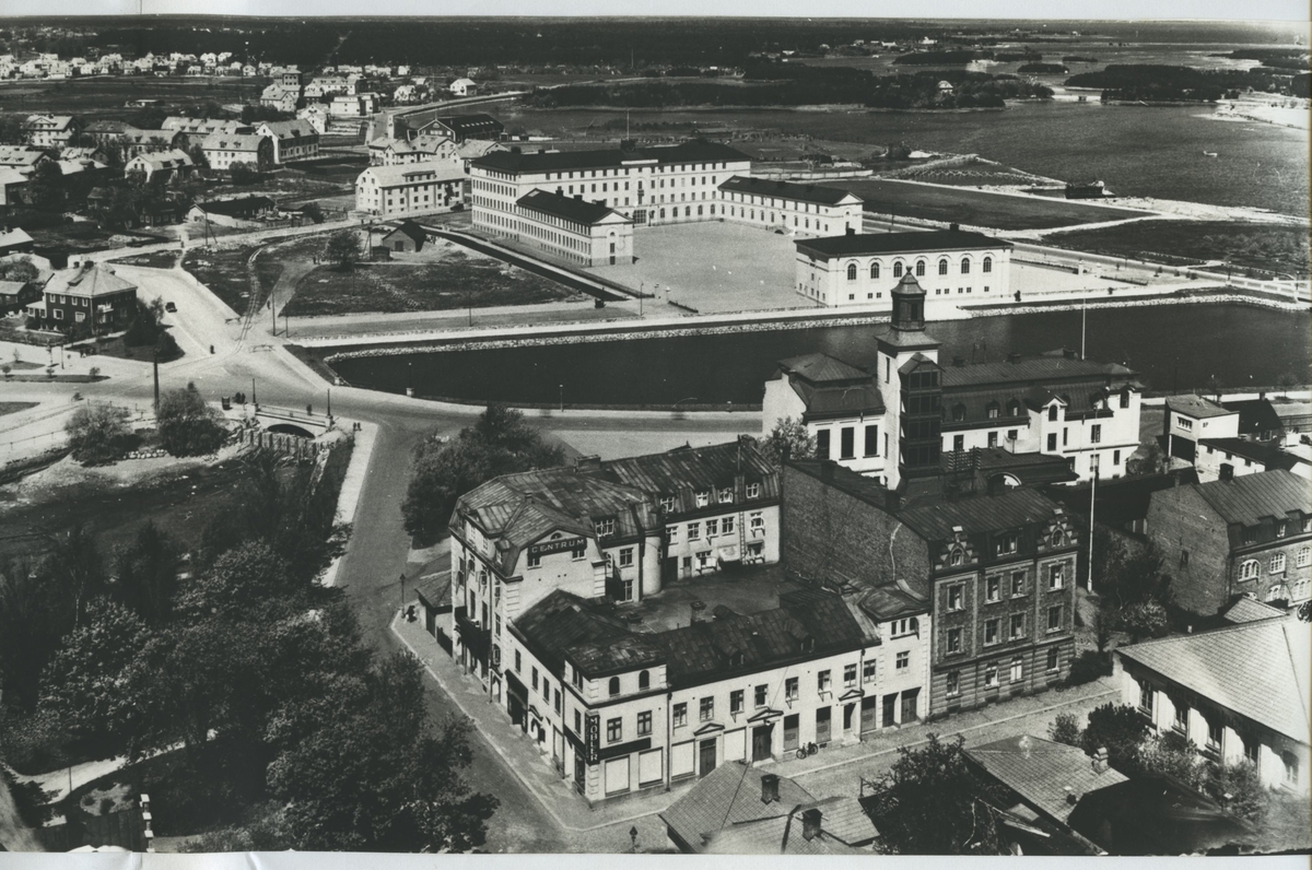 Stagneliusskolan och Malmbron vid utgrävningarna av Systraströmmen 1933-34.