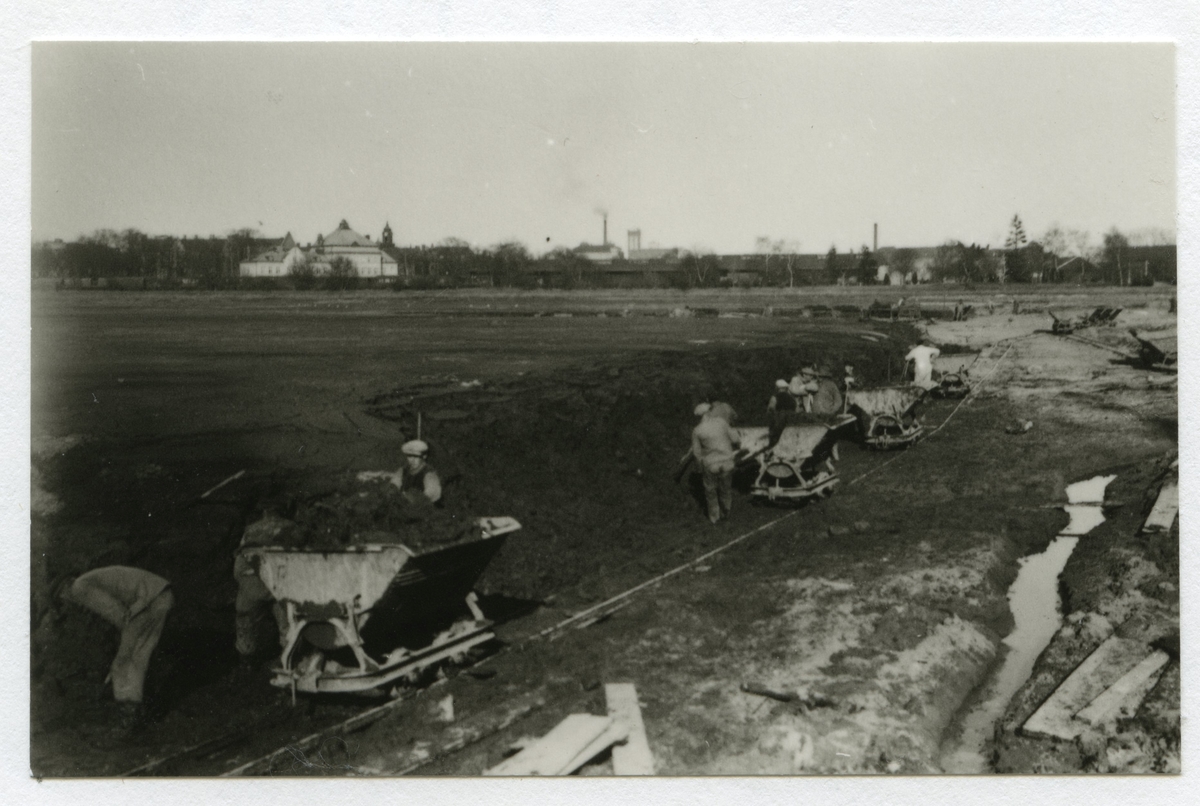 Utgrävningen av Slottsfjärden 1933-34. De massor som grävdes upp användes för att fylla ut Finngrundet och Tjärhovet. Massorna forslades i vagnar på en tillfällig järnväg. Vagnarna drogs av ett ånglok kallat "Pysen".