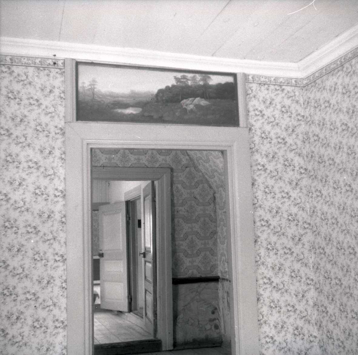 Interiör av hörnkammaren med oljemålning. I mangårdsbyggnaden på Runtorp 2.
