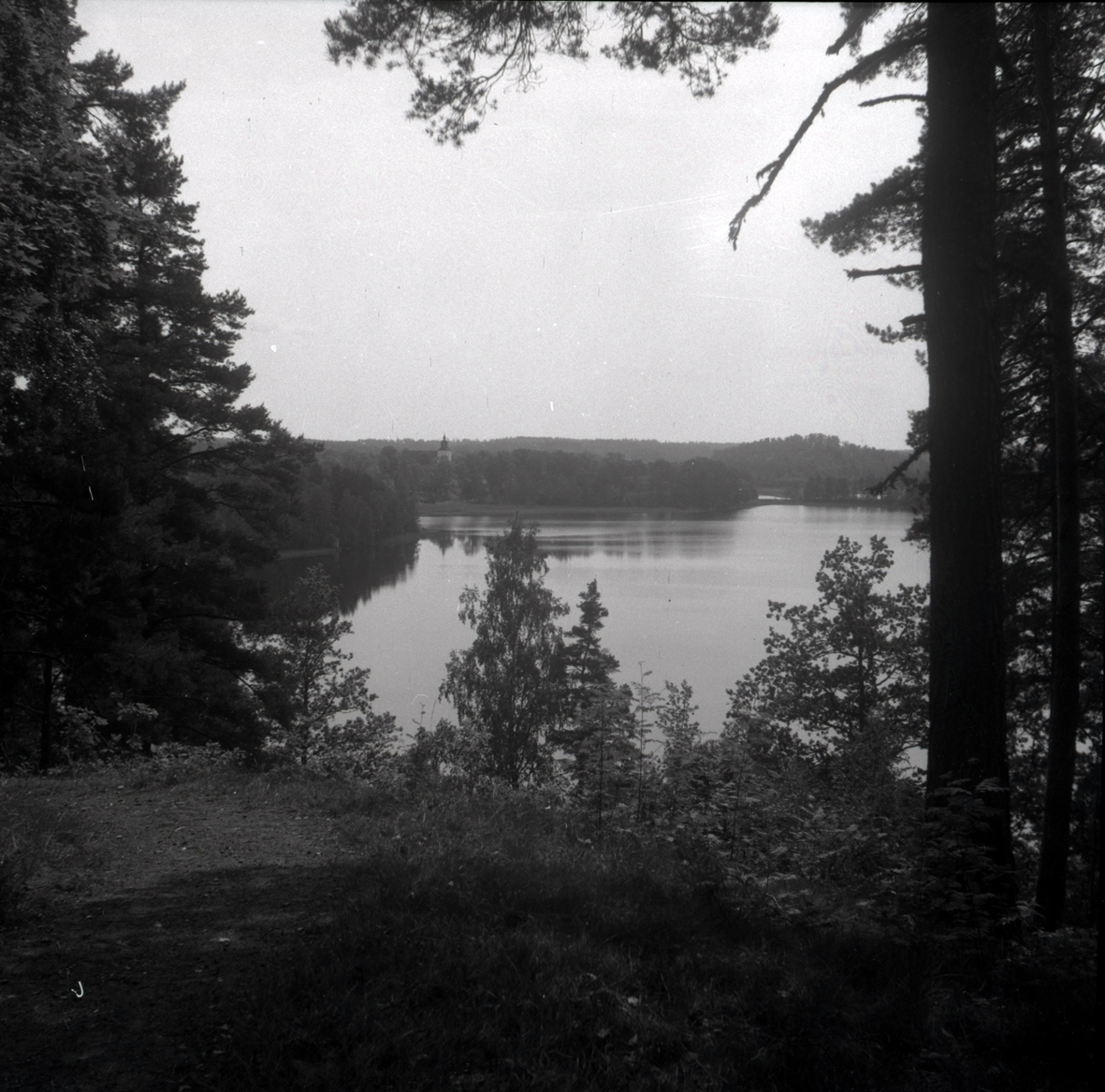 Sjöutsikt mot Odensvi kyrka, från Djurgårdskullen.