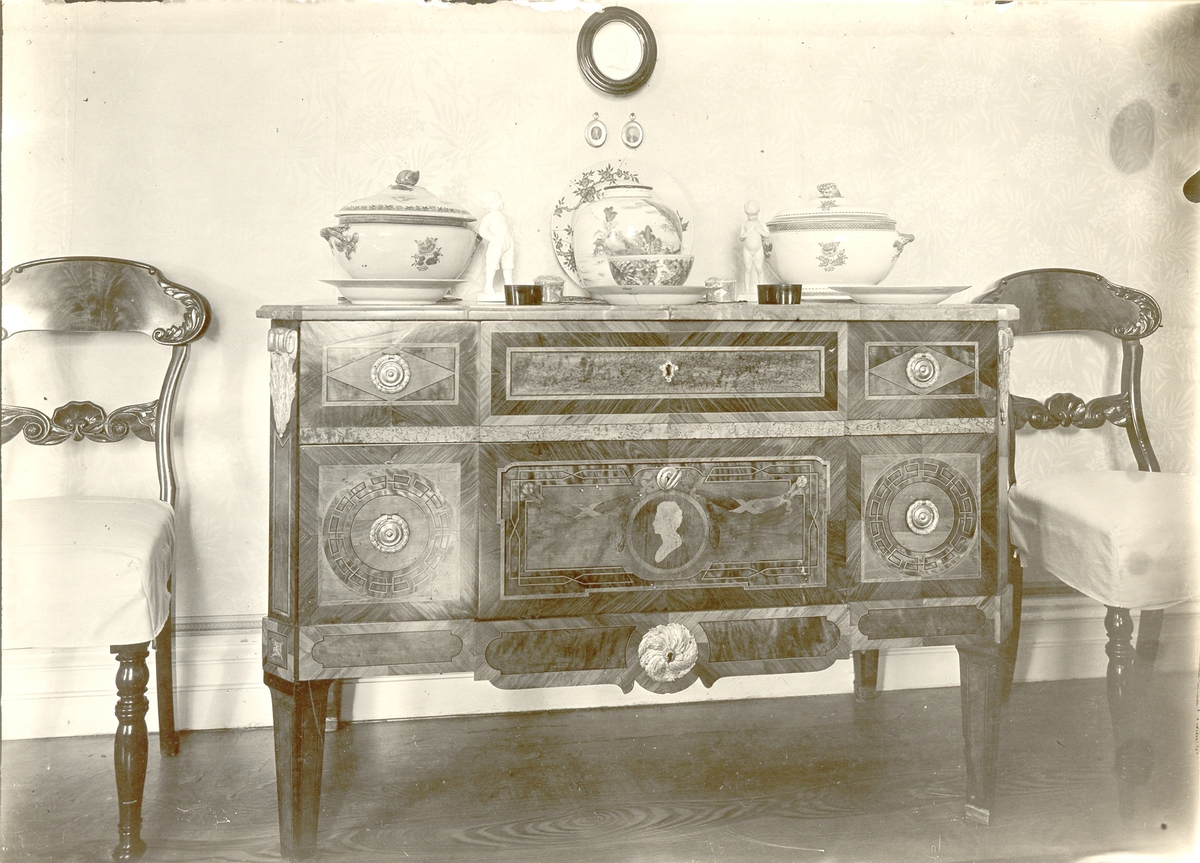 Byrå, gustaviansk (i salongen). Kommen från Valinge. Nuvarande ägarens (1925) farfars far,amiral Nordenskiöld, var gift med en Wrangel från Valinge.