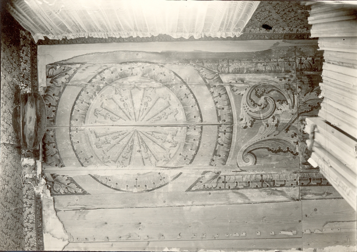 Östra flygeln. Del av paneltak med målad ornering i karolinsk barockstil, uppsatt i sekundärt läge i rummet till vänster om förstugan