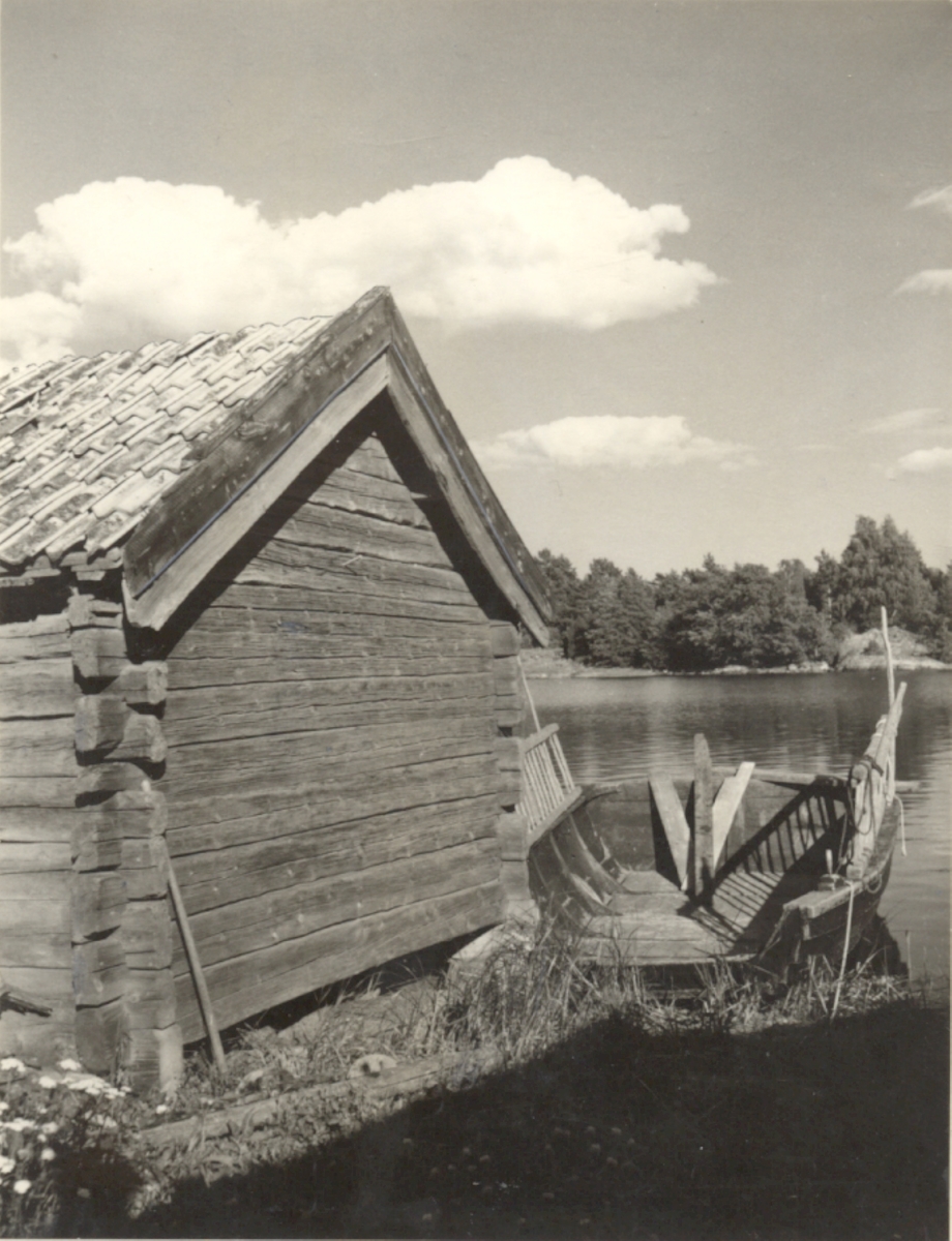Knuttimrad bod och vid sidan därom en pråm med grindar för hötransport.