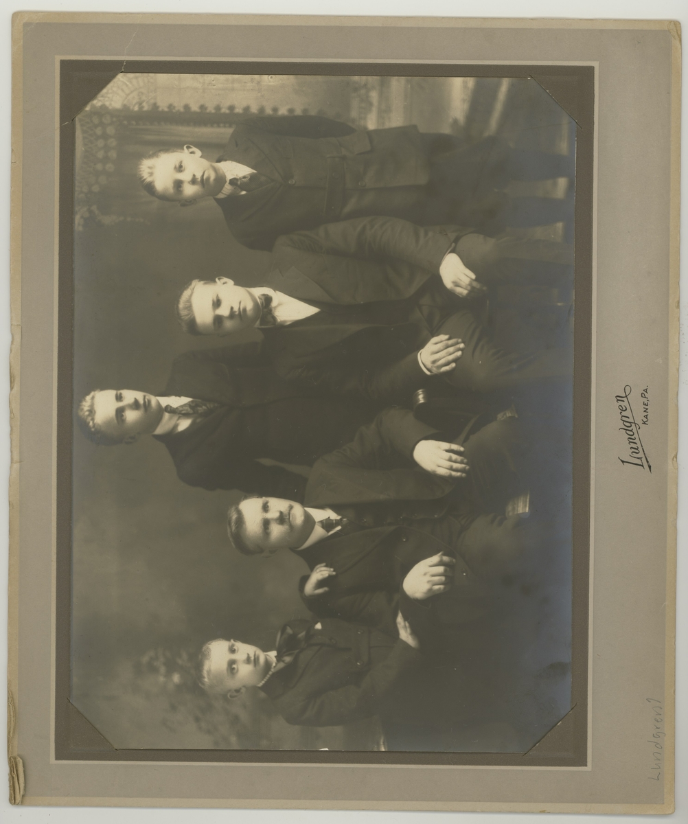 Carl Theodor Nilsson (Nelson) var född den 15/12 1868 i Madesjö socken (Gunnaremo?). Föräldar och barn flyttade den 2/11 1871 till Kristvalla (Slättingebygd) och därifrån till Kalmar den 12/4 1877. Carl Theodor utvandrade till USA 1888. Han besökte Sverige efter cirka 10 år men återvände till USA efter något år, där han var verksam inom byggnadsbranschen. Han gifte sig med en svenska omkring år 1900. Hustrun dog i slutet av 1910-talet och Carl Theodor den 10/3 1952, vilket framgår av brevet från sonen Hugo till hans kusin Elsa, som var född i Kalmar den 1/10 1899. Om de fyra sönerna saknas uppgifter, veterligen har de aldrig besökt det gamla landet. Kortet är antagligen taget omkring 1920. Tidningsurklippet ur the Daily Republican av den 5/6 1946 kom någon gång från familjen Nelson till någon av bröderna i Kalmar, vilka nu är döda.