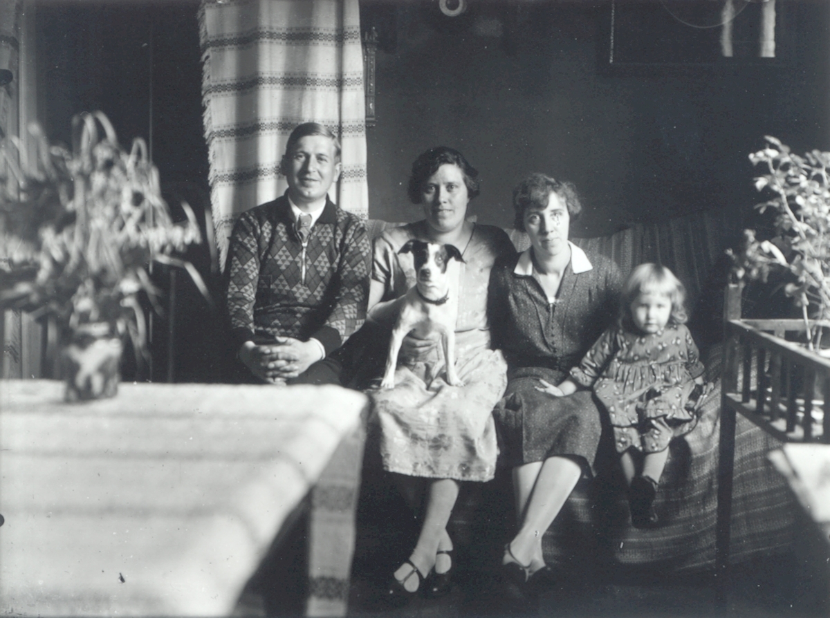 Från vänster: Folkskolläraren Helge Schlyter. Märta Nikolausson, född Lindström fru Linnéa Schlyter dottern Birgit (Bibbi) samt släthåriga terriern Bella. Fotot taget i lärarbostadens vardagsrum.