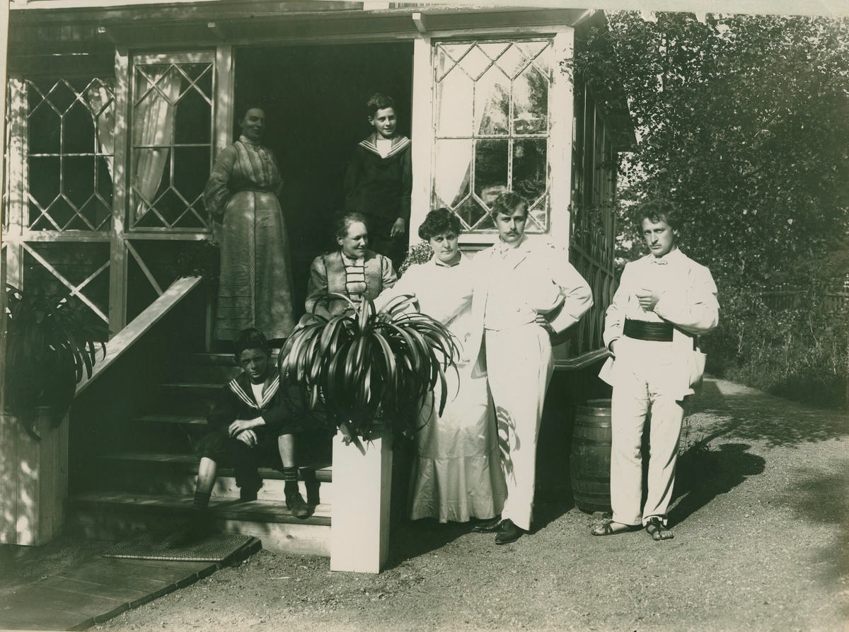 Titel: Fröken Forssanders hem i Korsberga. På bilden syns frkn F. sittande på trappan. Bredvid operasångerskan Mathilda Jungstedt med sin make, konstnären Fritz Reuterswärd. Skådespelaren Anton de Verdier. De båda gossarna fru Jungstedts söner med operasångaren Emil Lindau i hennes första gifte.Den ene av dem artisten Kurt Jungstedt.