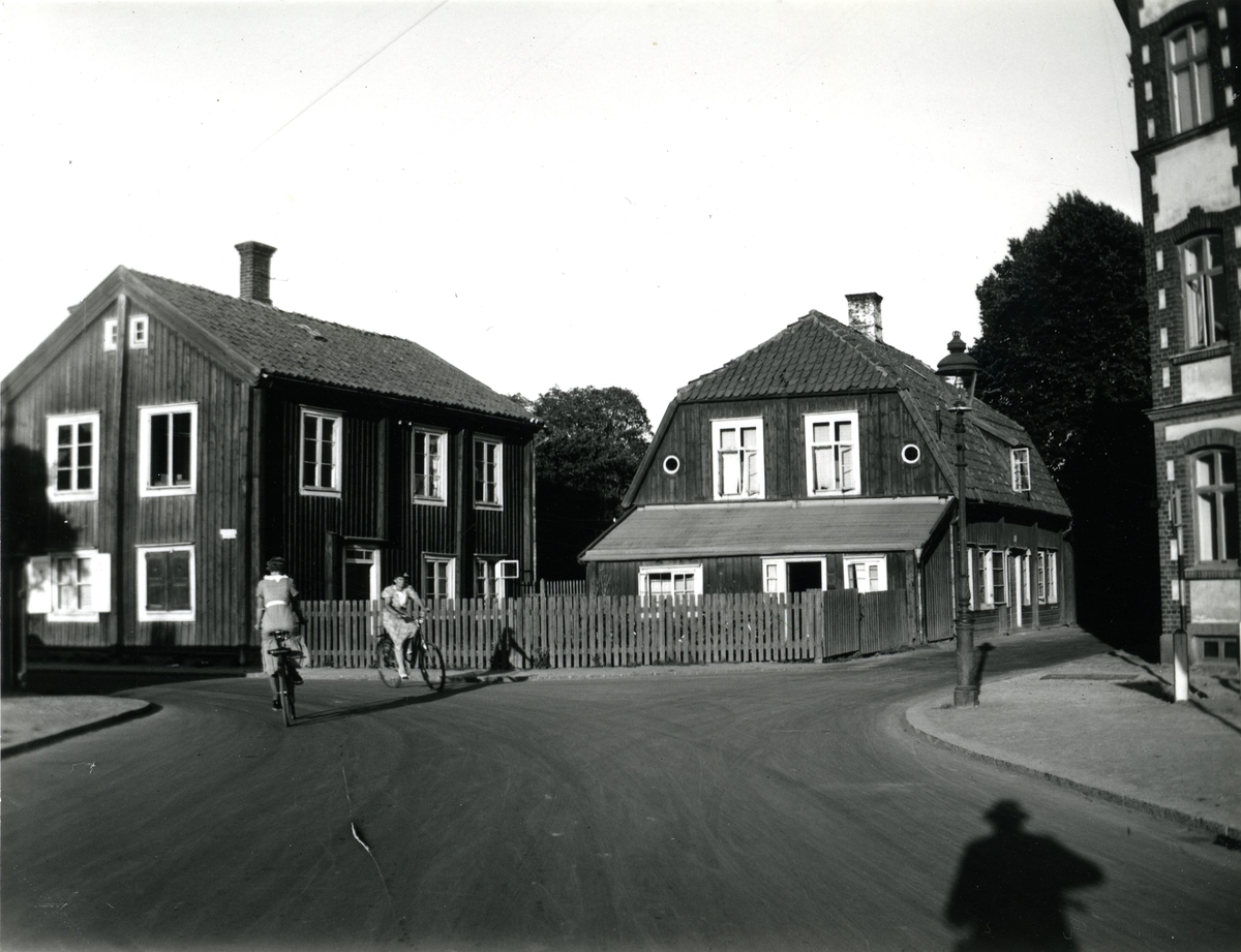 Korsningen Lindölundsgatan - Trädgårdsgatan. Huset med brutet tak är "Barnhemmet". Huset till vänster är Lindölundsgatan 6 och längst till höger i bild Linölundsgatan 4.