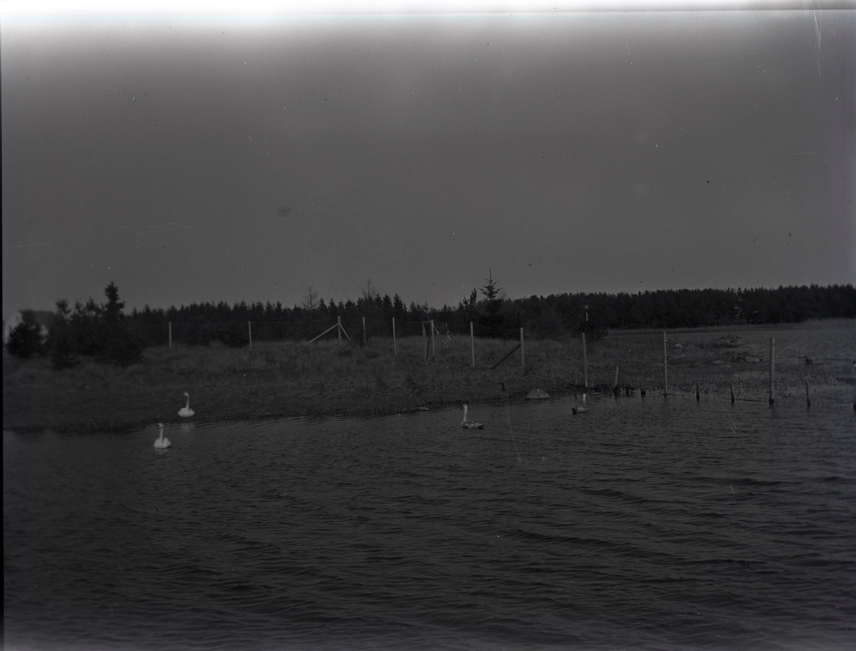 En strandkant med svanar.