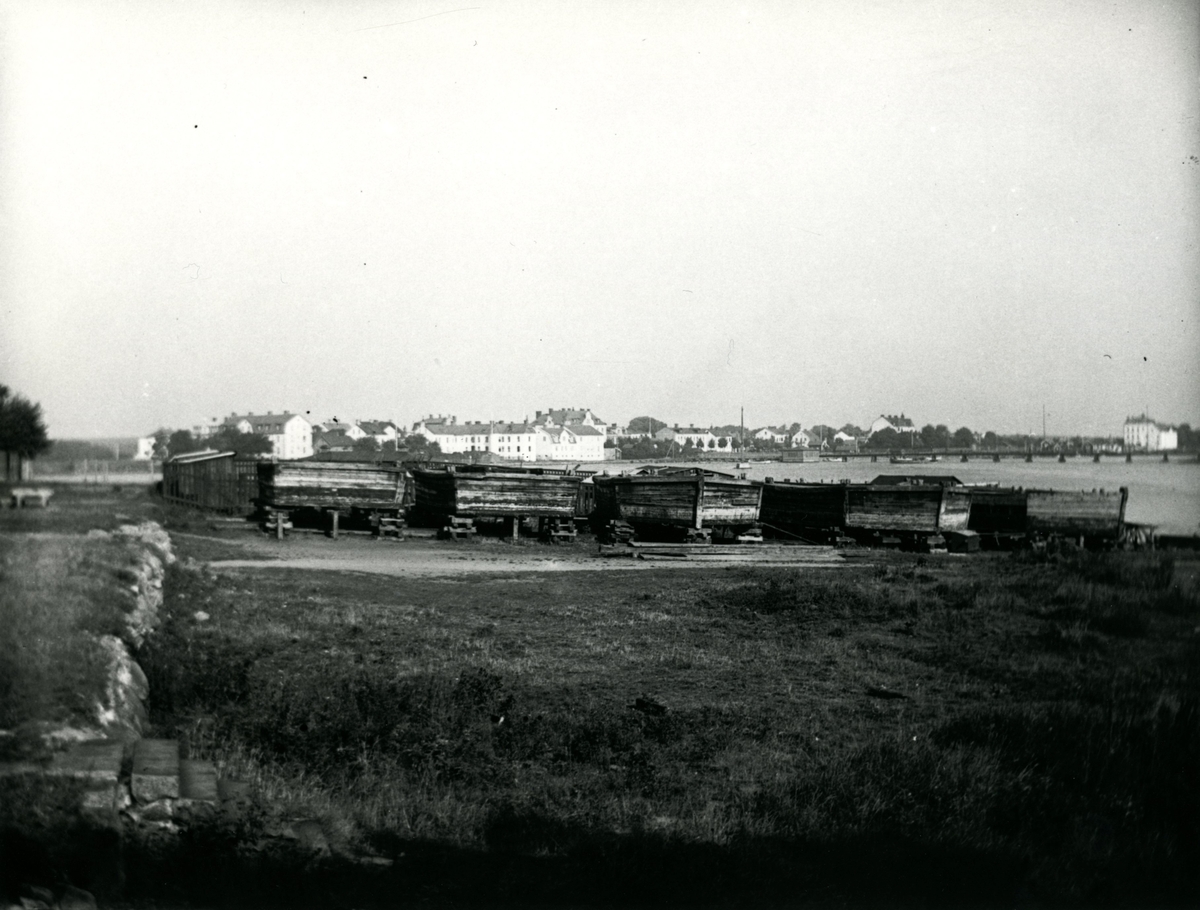 Pråmslipen. Upplagsplats för pråmar på Kattrumpan i kalmar. Vid bron till Varvsholmen syns Ängös klapphus.